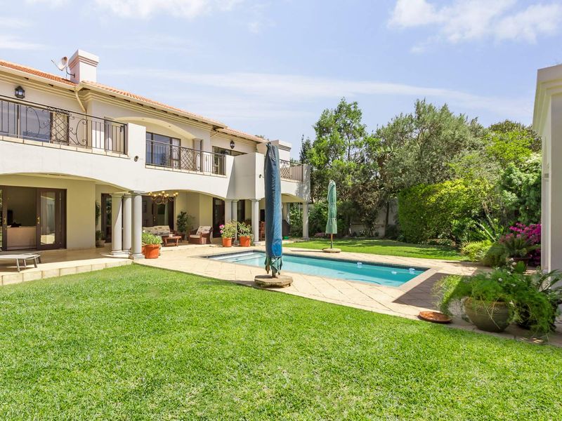 Park-side family living in a leafy, secure estate with greenbelt access — triple-size covered patio with built-in braai, pool and garden; five bedrooms, staff suite and three garages.