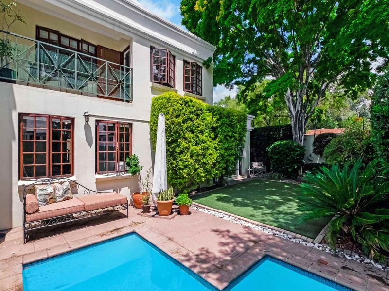 Relaxed family living in heart of Lonehill with 24/7 security and easy access to Lonehill Shopping Centre; enclosed patio overlooks private garden and sparkling swimming pool. Four bedrooms, 3.5 baths.