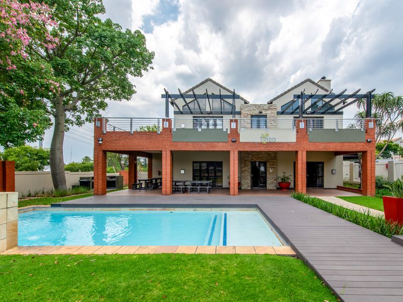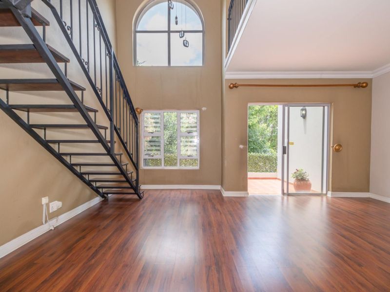 Elevated, private top-floor living in Quarrywood Estate with koppie views and double-volume ceilings; versatile loft entertainment space opens to a sunny patio. Two bedrooms, two bathrooms near Lonehill amenities.
