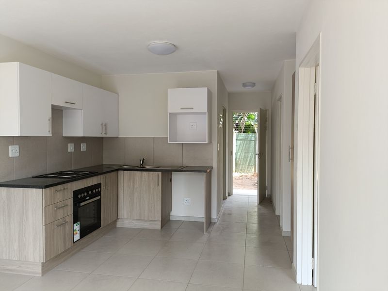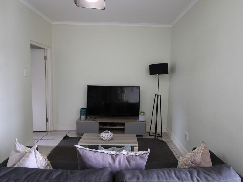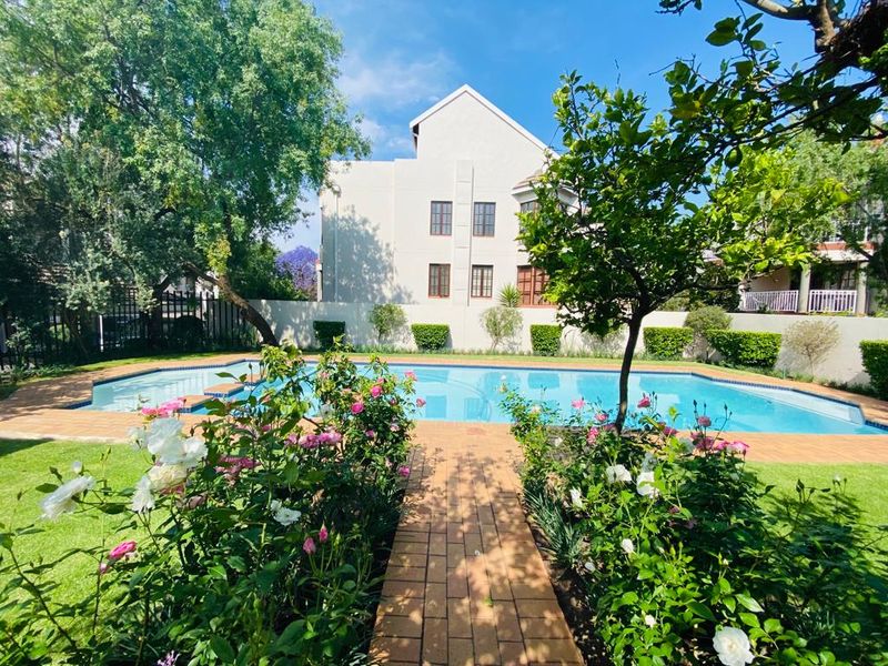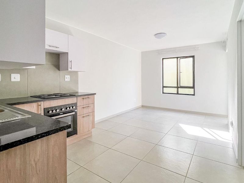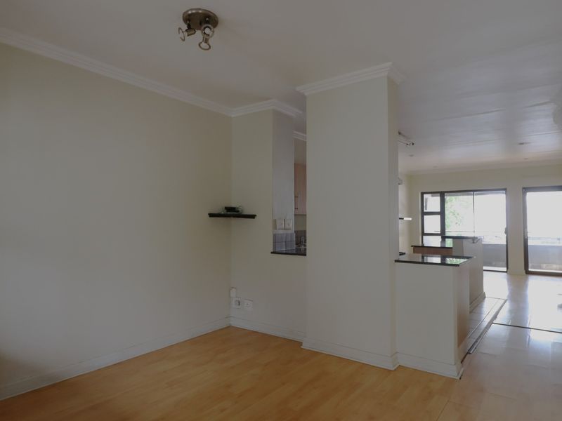 Enjoy vibrant Rivonia living with shops and Gautrain access; ground-floor two-bedroom, one-bath apartment offers load-shedding backup option, pool access and two covered parking.