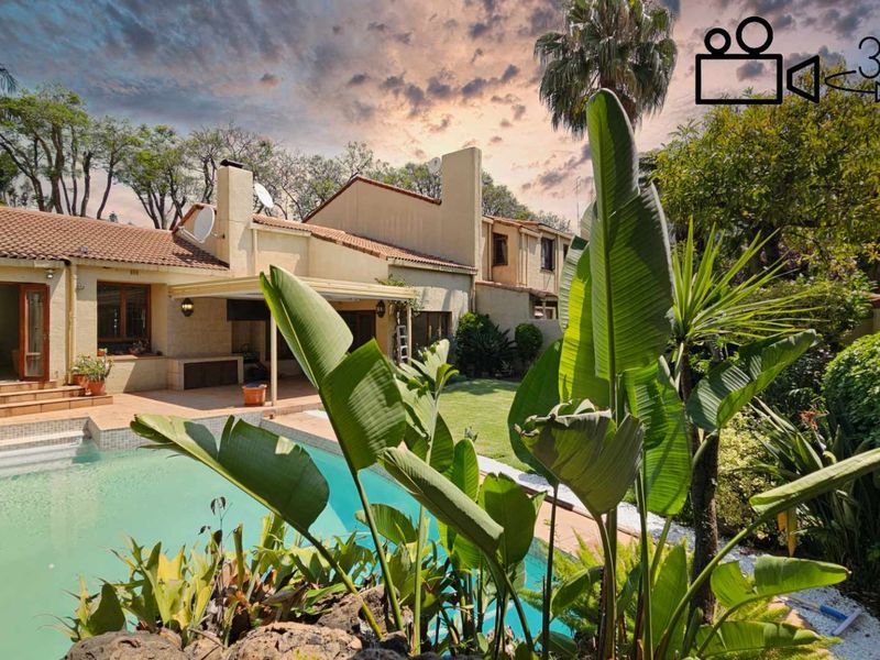 Entertain and relax in Sandton's vibrant heart with a private garden oasis and rock-formation pool, covered patio, easy access to Gautrain and malls — three bedrooms, 2.5 baths, double garage.