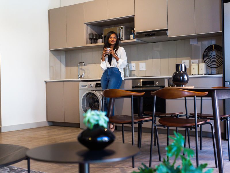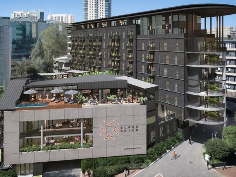 Urban lifestyle in Sandton's BlackBrick 2 — light-filled studio with stone kitchen, rooftop deck and 24-hour concierge, gym and co-working, walking distance to Gautrain and Sandton City.