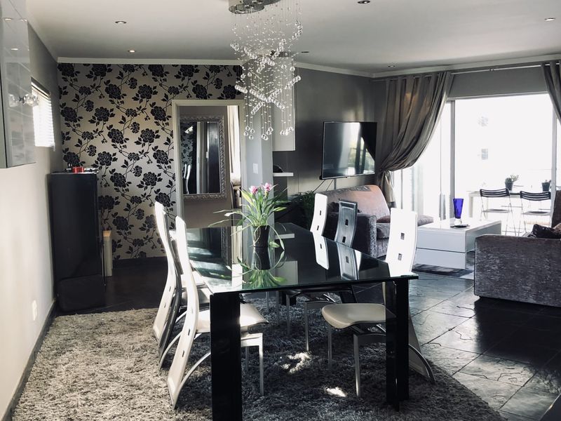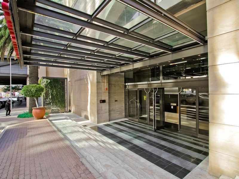 Live a cosmopolitan Sandton lifestyle, walking distance to Sandton City — high-floor apartment with panoramic views, balcony patio and pool; two beds, two baths, two covered parking, furnished.
