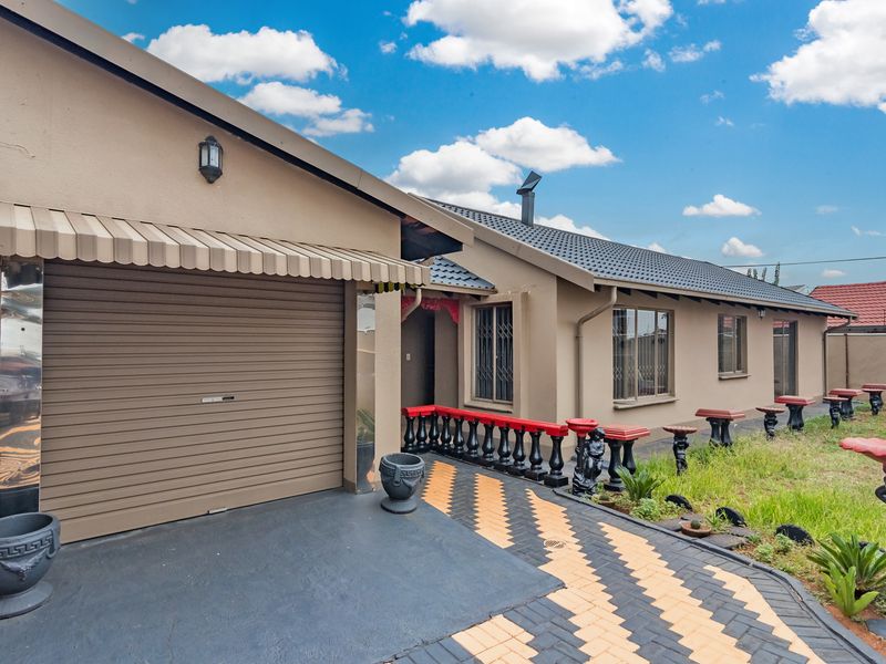 Flexible family living with built-in rental income, 15-minute walk to Protea Glen Mall. Main house plus two outside en-suite rooms yield R10,000/month; five bedrooms, three bathrooms, garage.