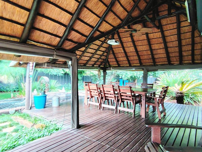 Entertainer's oasis in Vanderbijlpark SW 5 with lush landscaped garden and water feature, thatched lapa with built-in braai and projector — three bedrooms, two bathrooms, four garages.