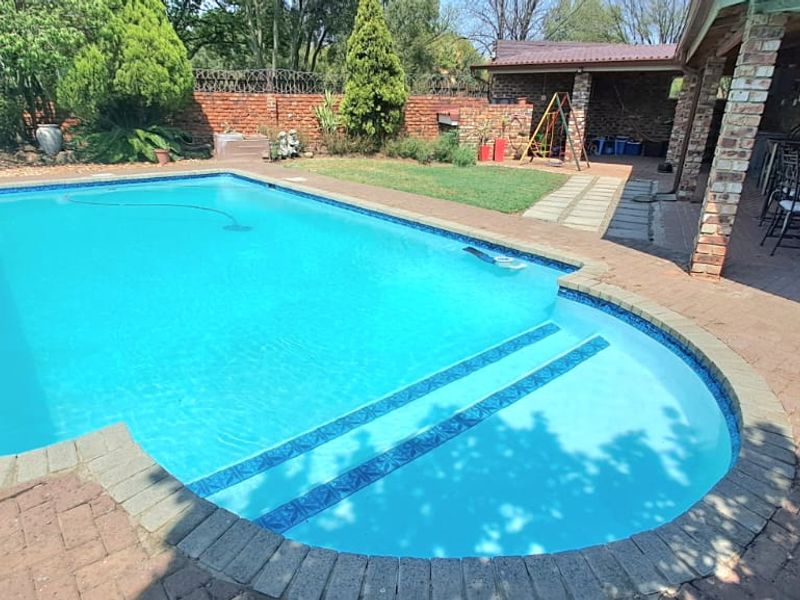 Entertainer’s oasis on a nearly 2,000 m² plot with pool, lapa and fitted bar; spacious open-plan living, modern kitchen, borehole irrigation. Four bedrooms, three bathrooms, double garage.
