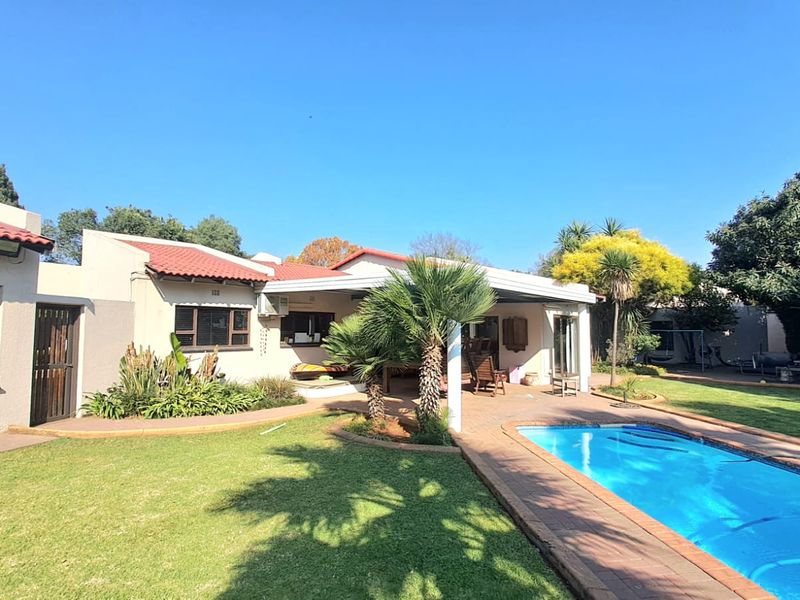 Family-focused home within walking distance of Suikerbos Primary School, with lush garden and sparkling pool, versatile entertainment room and bachelor’s flat — four bedrooms, three bathrooms, ample parking.