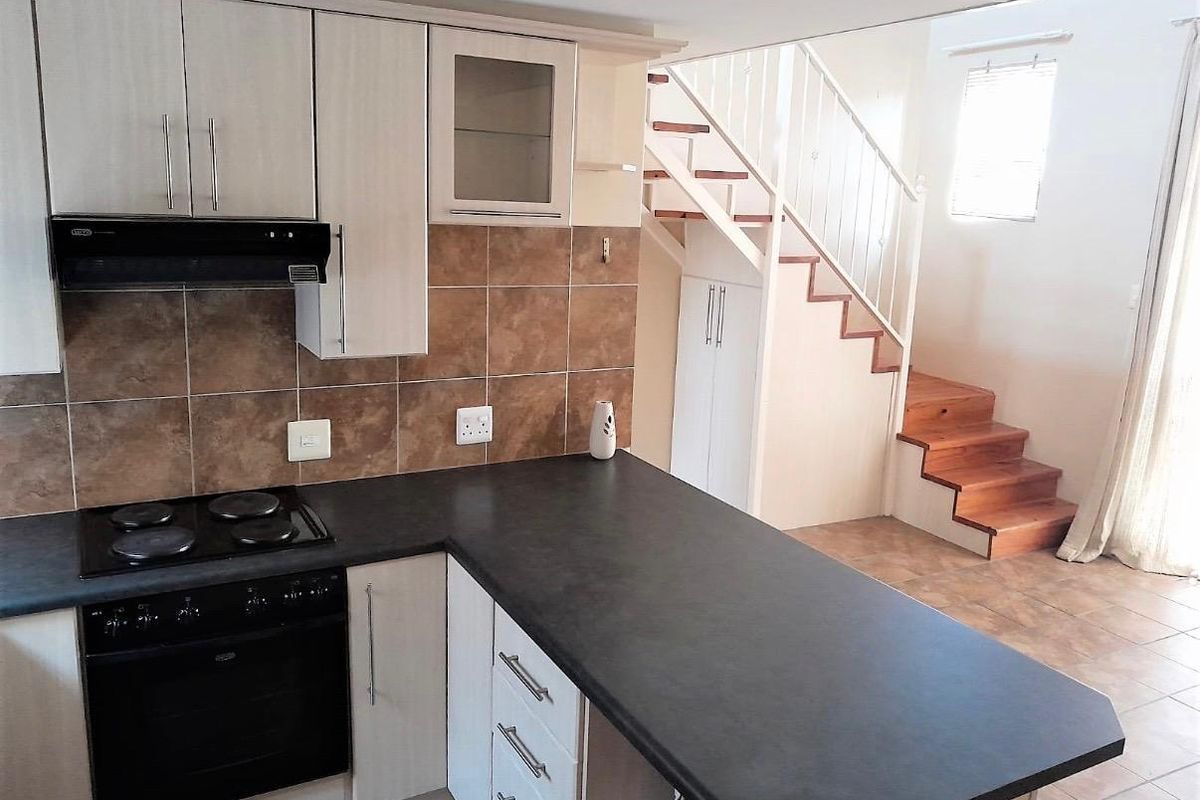 This super neat unit with a peaceful atmosphere on ground floor, flows into a fully fitted, open plan tiled kitchen with ample built in cupboards with an electric stove with hob, double basin PLUS a washing machine corner! Flows to the living area with sliding door & security gate to your enclosed courtyard and lovely braai to relax!