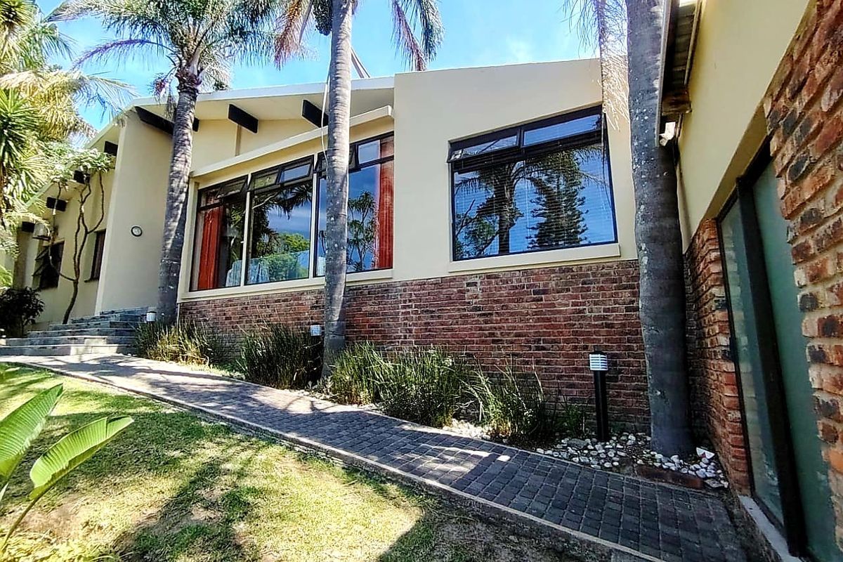 Entertainer's family retreat in Beacon Bay, East London — leafy fruit-tree garden and sparkling pool, large entertainment area with bar and braai; includes bachelor flat and double garage.