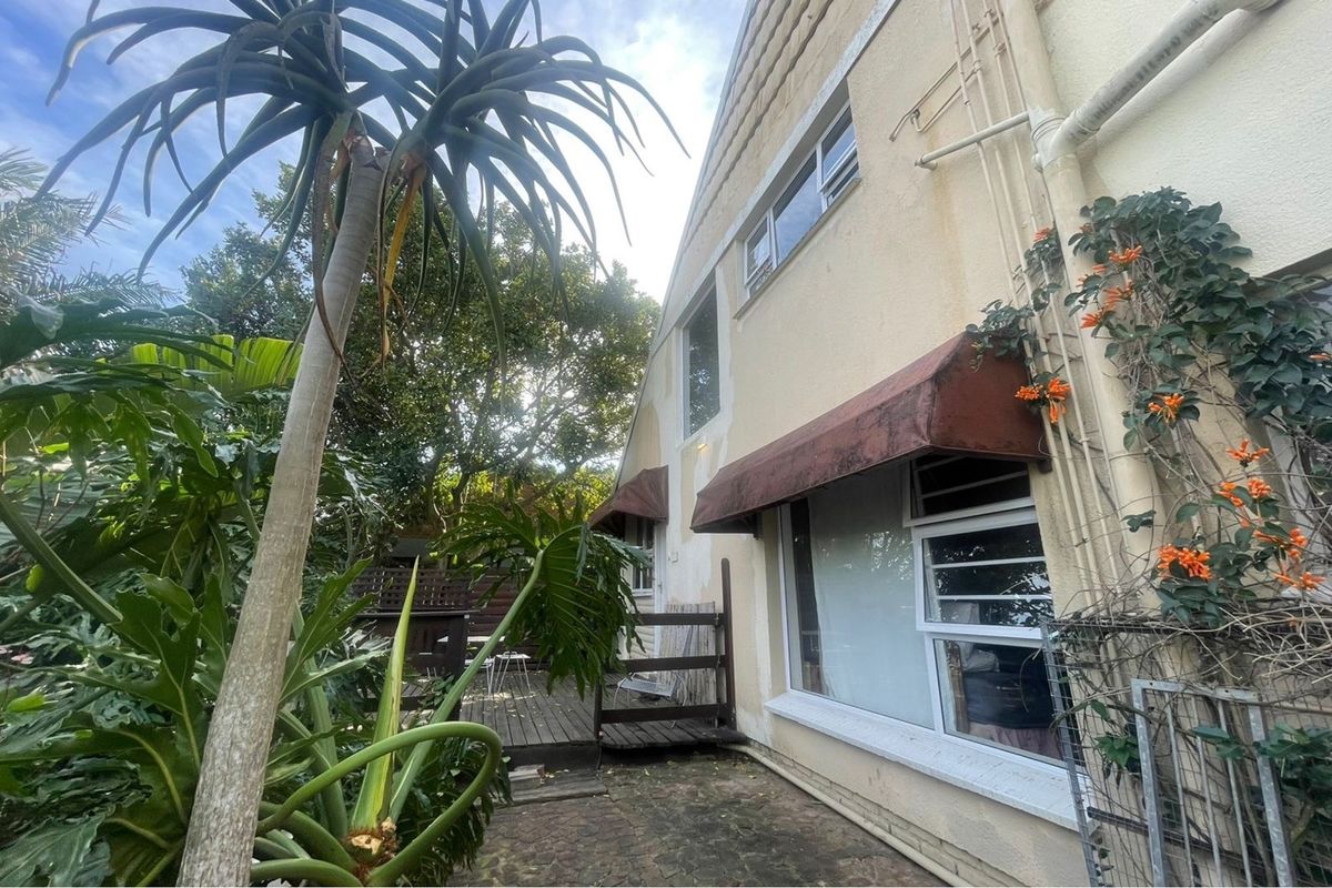 Relaxed coastal living in tranquil Cintsa East with a sea-view deck and outdoor braai; open-plan upstairs living, second kitchen/laundry, four bedrooms, three bathrooms, double garage.