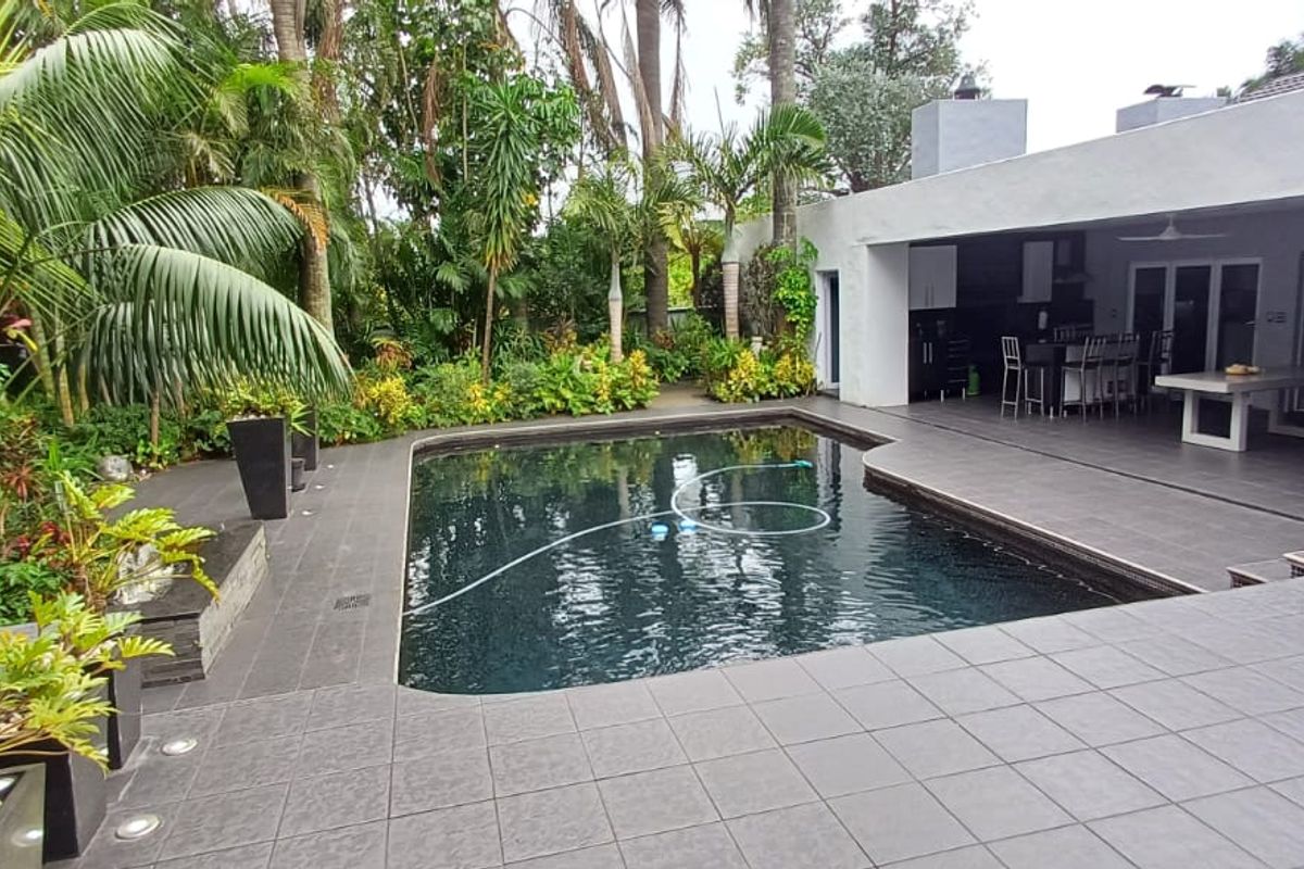 Relaxed luxury living in Nahoon Valley with seamless indoor-outdoor flow around a striking black swimming pool — five bedrooms, four bathrooms and expansive garaging for up to seven vehicles.