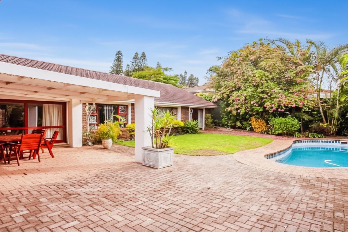 Coastal family living in Stirling’s leafy streets near Nahoon Beach and top schools, featuring undercover patio with pool and braai — spacious layout with four bedrooms, three garages.
