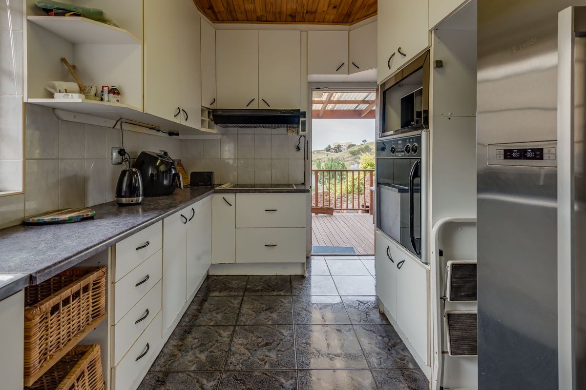The dining room flows seamlessly into the lounge area, creating a light and adaptable living space. The kitchen offers ample cupboard space and opens onto a covered deck, with steps leading down to a private garden and built-in braai area, perfect for entertaining.