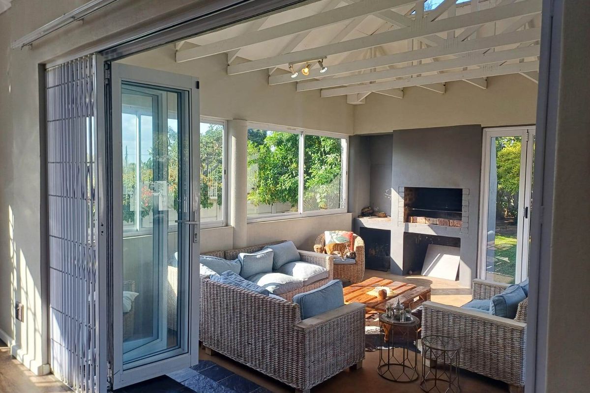Indoor Braai Area: Features foldable doors/windows, exposed trusses, and a Stackadoor, creating a seamless indoor-outdoor living experience that opens directly to the spacious garden – ideal for summer gatherings.
