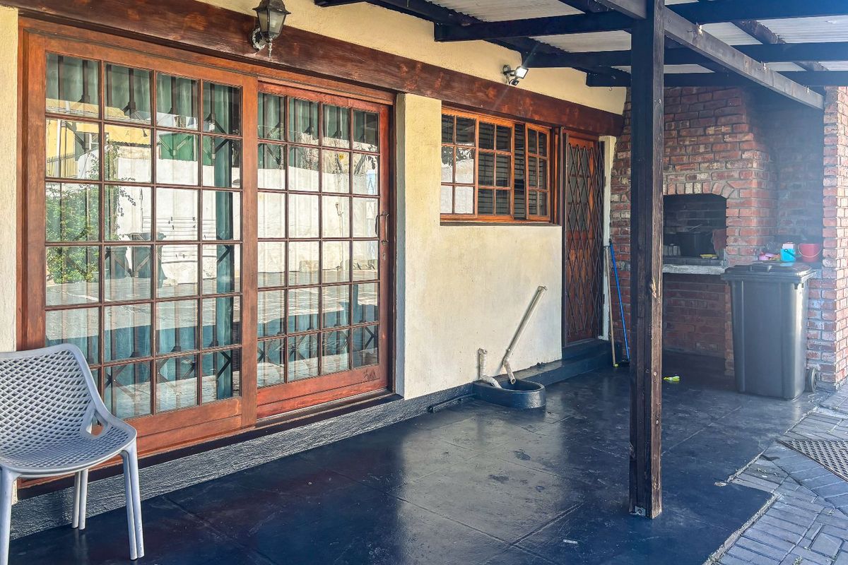 The second dwelling is equally inviting, offering comfortable family living with great entertainment features. A covered patio with a built-in braai creates the perfect space for relaxed gatherings. Inside, the open-plan kitchen and living area includes space for a breakfast bar, while the lounge is warmed by a cosy wood-burning fireplace. Two generously sized bedrooms, both with built-in cupboards, are serviced by a full bathroom with a bath and overhead shower, along with a separate guest toilet.