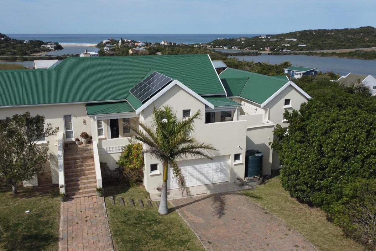 Riverside entertaining with West Kleinemonde river and ocean views from a double-height living area opening onto a large deck and braai nook. Five beds, four baths, double garage.