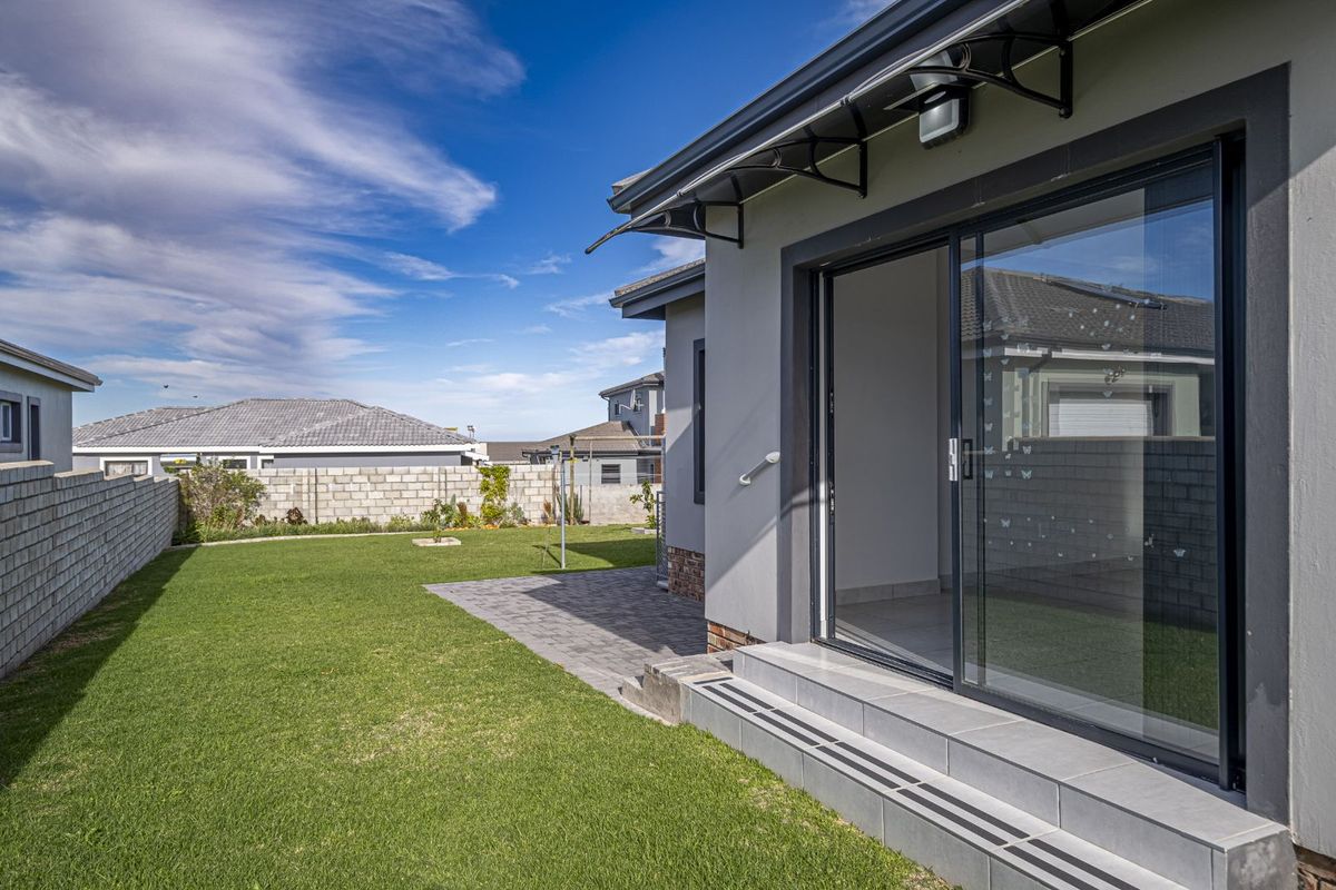 Low-maintenance family living in sought-after Fountains Estate, Jeffreys Bay — open-plan kitchen with indoor braai, lush grassed garden and rainwater tanks. Three beds, two baths, double garage.