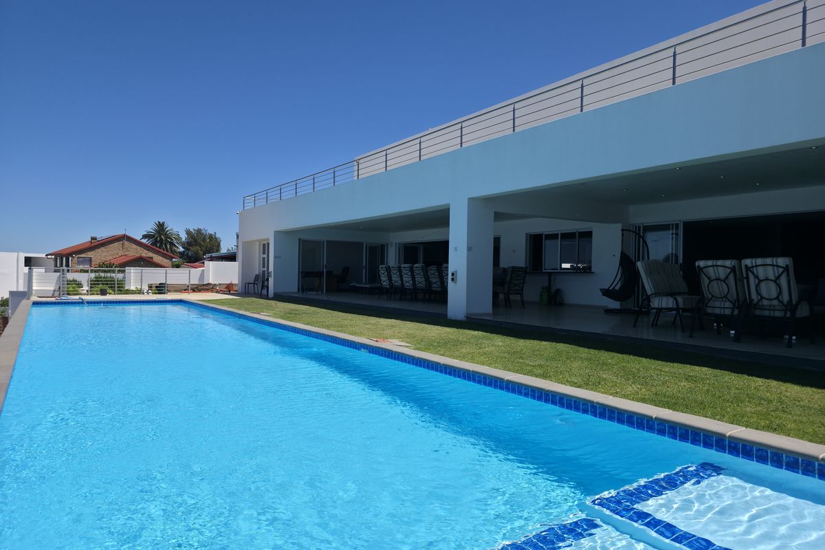 Embrace Jeffreys Bay surf-side living just steps from the beach, with panoramic ocean views, a saltwater pool and gym; five bedrooms, four bathrooms, three-car garage.
