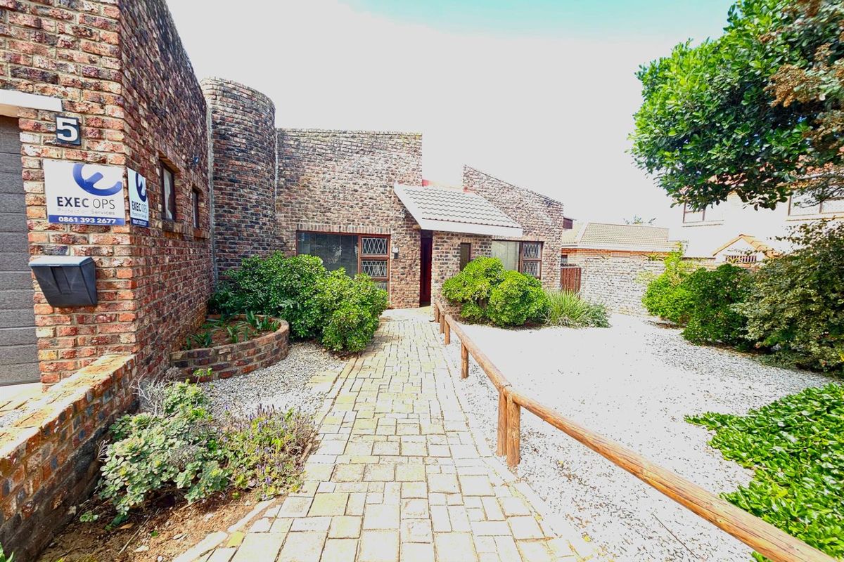 The living areas flow onto a sunny patio with a built-in braai and ample space for outdoor dining, overlooking a lush, private garden.