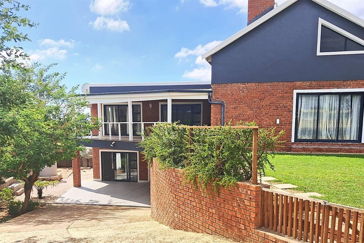 The home features a striking double-volume design with exposed trusses and a generous 98m2 open-plan living area, complete with a built-in braai. The kitchen is well-equipped with granite countertops, a breakfast island, ample cupboards, and a separate scullery.