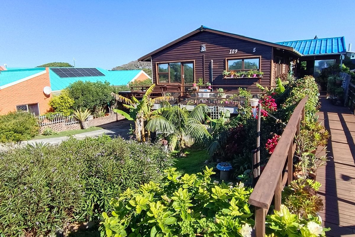 Relaxed coastal living in Paradise Beach, Jeffreys Bay — walking distance to the beach, wraparound deck overlooking a lush garden and two self-contained flats for income.