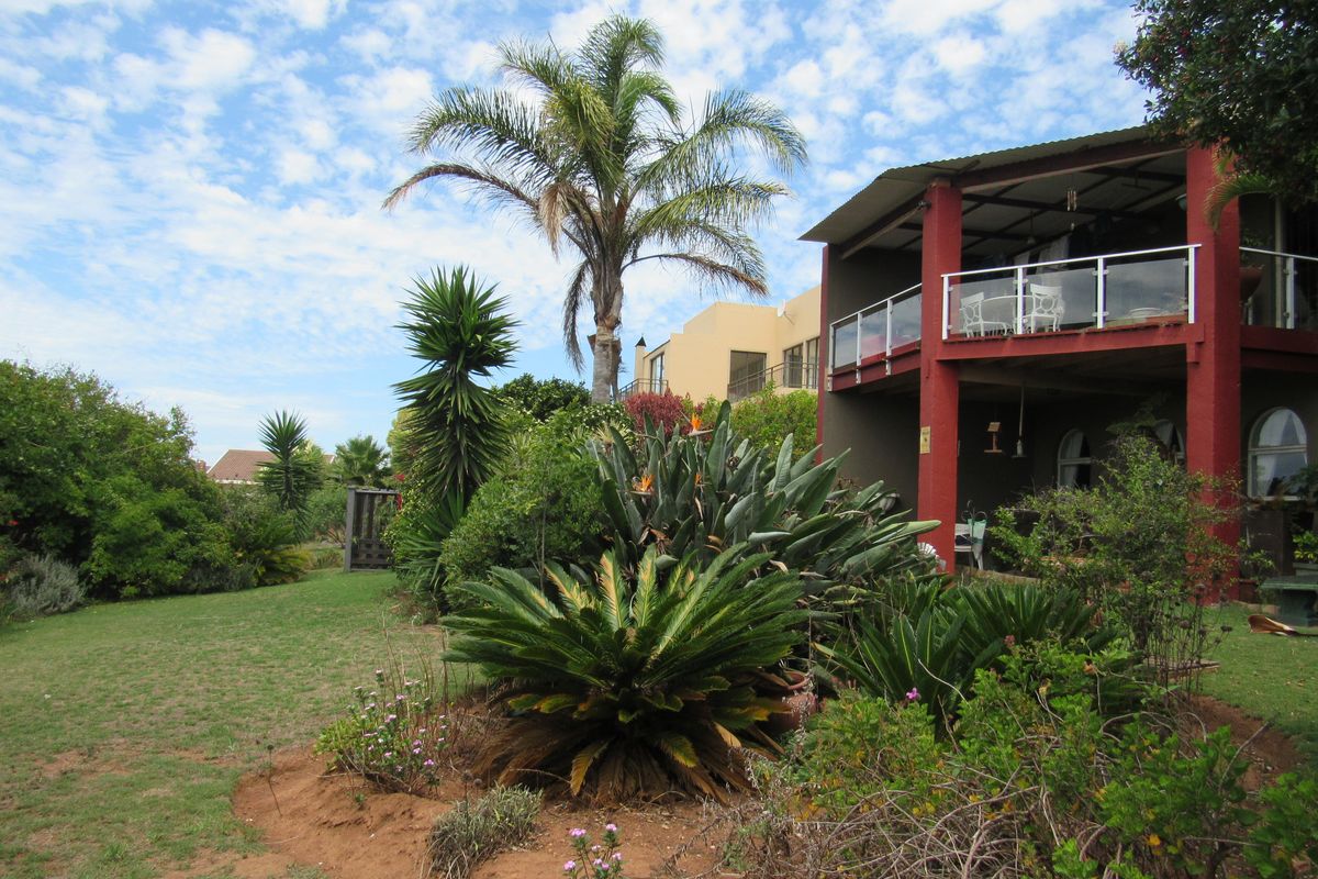 Relaxed beachside lifestyle in Wavecrest, Jeffreys Bay, short stroll to surf and sand, private wooden deck with ocean and greenbelt views, tropical garden, four bedrooms, 2.5 baths.