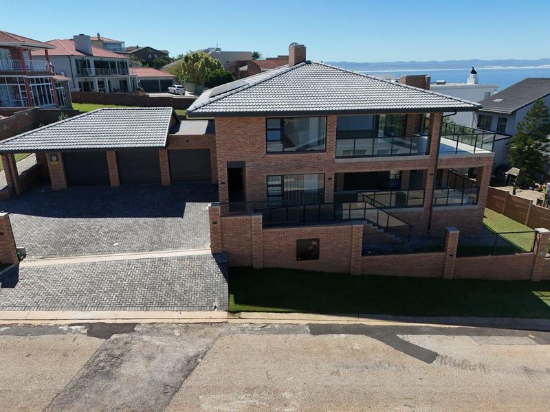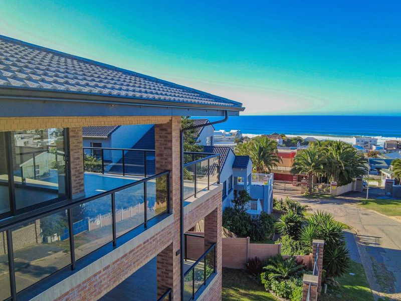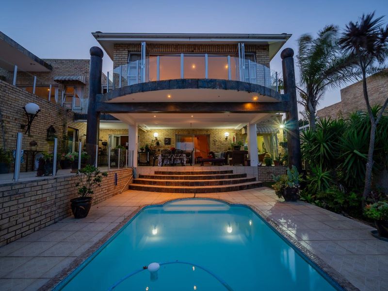 Entertainer's coastal retreat in prime Jeffreys Bay, poolside entertainment and ocean-view master balcony — ideal guest-house potential. Five bedrooms, five bathrooms, automated four-car garage.