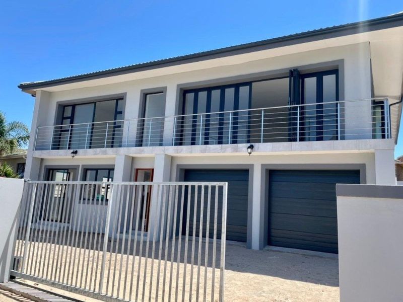 Coastal living steps from Jeffreys Bay beaches and surf breaks, offering distant sea views and an enclosed braai with stacker doors to a sunny balcony; five beds, double garage.