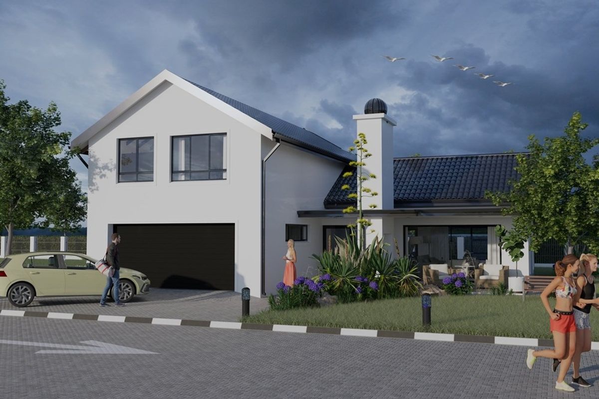 Each plot-and-plan package ensures a stress-free build process, managed from start to finish by experienced developers. These thoughtfully designed double-storey homes boast open-plan living with modern finishes, high ceilings, and large aluminium windows that flood the interiors with abundant natural light. A spacious double garage provides direct access to the kitchen, which flows seamlessly into a bright lounge and dining area. Sliding doors lead to a covered patio with a built-in braai, perfect for entertaining or enjoying coastal sunsets. On the ground floor, an en-suite bedroom is ideal for guests or those preferring single-level living, while upstairs, two additional en-suite bedrooms flank a versatile study nook, making it perfect for remote work or relaxation.