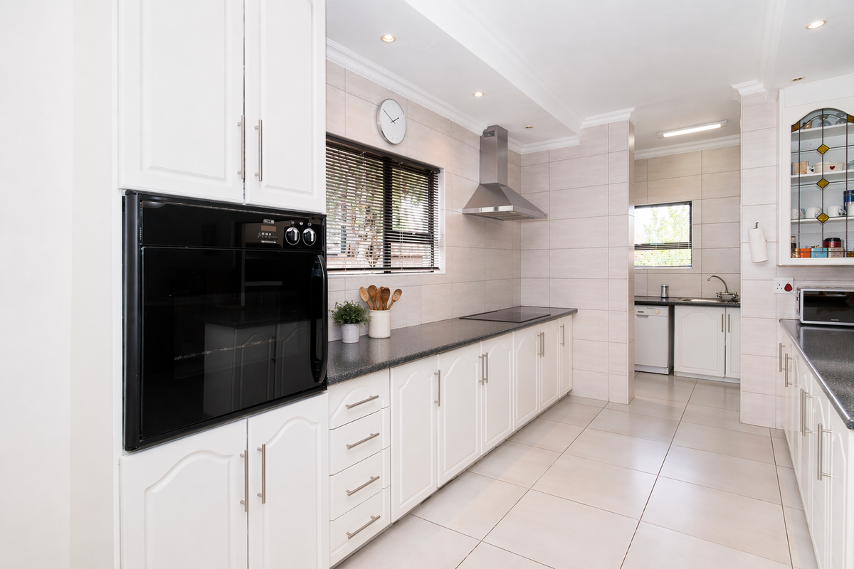 The living areas extend to an enclosed patio with a built-in braai, opening onto a neat garden with an irrigation system, creating the ideal indoor-outdoor lifestyle. A convenient guest toilet is also located on the ground floor. The well-appointed kitchen features granite countertops, an eye-level oven, electric hob, space for a double fridge/freezer, walk-in pantry and a separate scullery with space for a dishwasher, washing machine and tumble dryer.