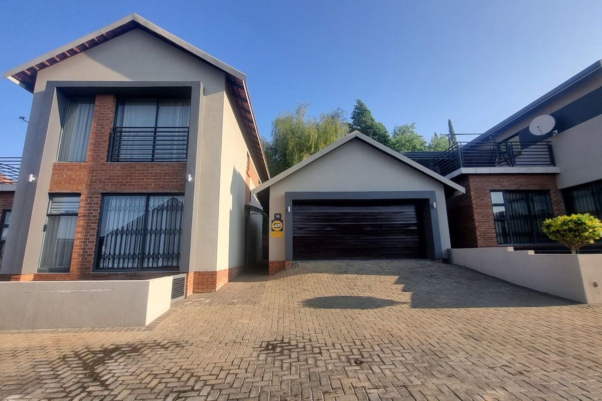 Enjoy relaxed, entertainer's living in leafy Wild Olive secure complex — rooftop braai patio with sunlit views, double-volume light-filled lounge, three bedrooms, two-and-a-half baths, double garage.