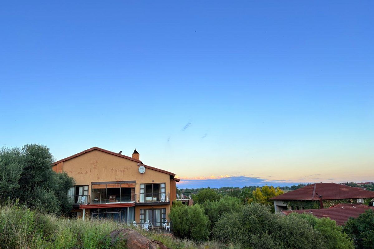 The home welcomes you with a spacious open-plan dining, living and kitchen area featuring double-volume ceilings that enhance the sense of light and space. A second living area overlooks the green belt includes a built-in braai and cozy fireplace – ideal for those crisp Free State evenings. Sliding doors open onto a covered patio where you can relax or entertain while soaking in the magnificent views.