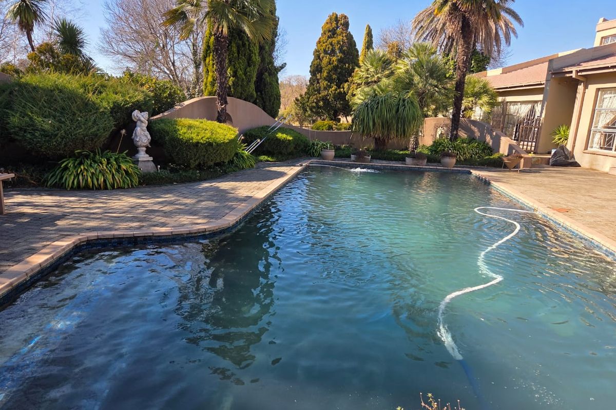 Warm, light-filled family entertainer in a lush, borehole-fed garden with central courtyard pool, bar/braai entertainment room, loft spaces — 5 beds, 3.5 baths, double garage.