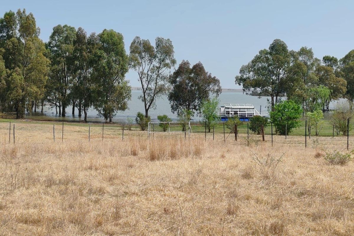 Waterside retreat on Oranjeville's Vaal Dam, perfect for fishing and sunset evenings; incomplete wooden log home with open-plan living, patio access, three en-suite bedrooms and single carport.