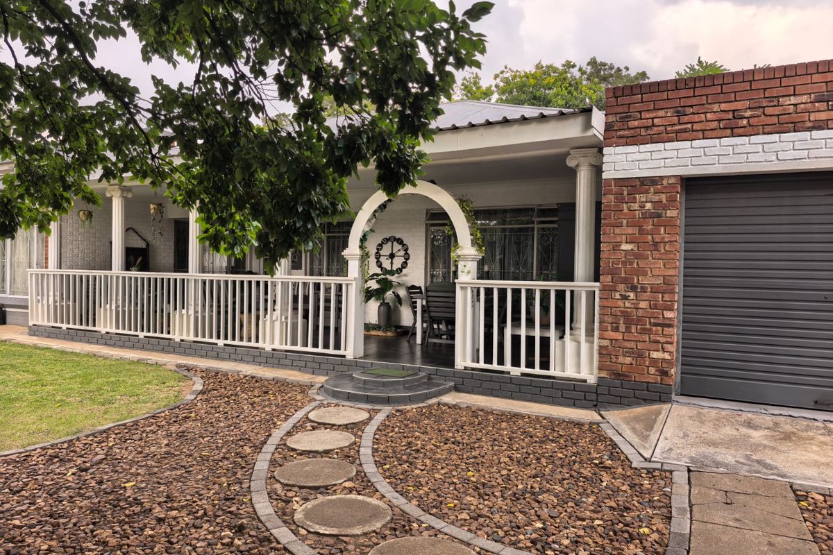 Relaxed family living near Parys shopping mall with a shaded verandah and maintained garden, open-plan lounge, separate scullery and one-bedroom flatlet—three beds, three baths, double garage.