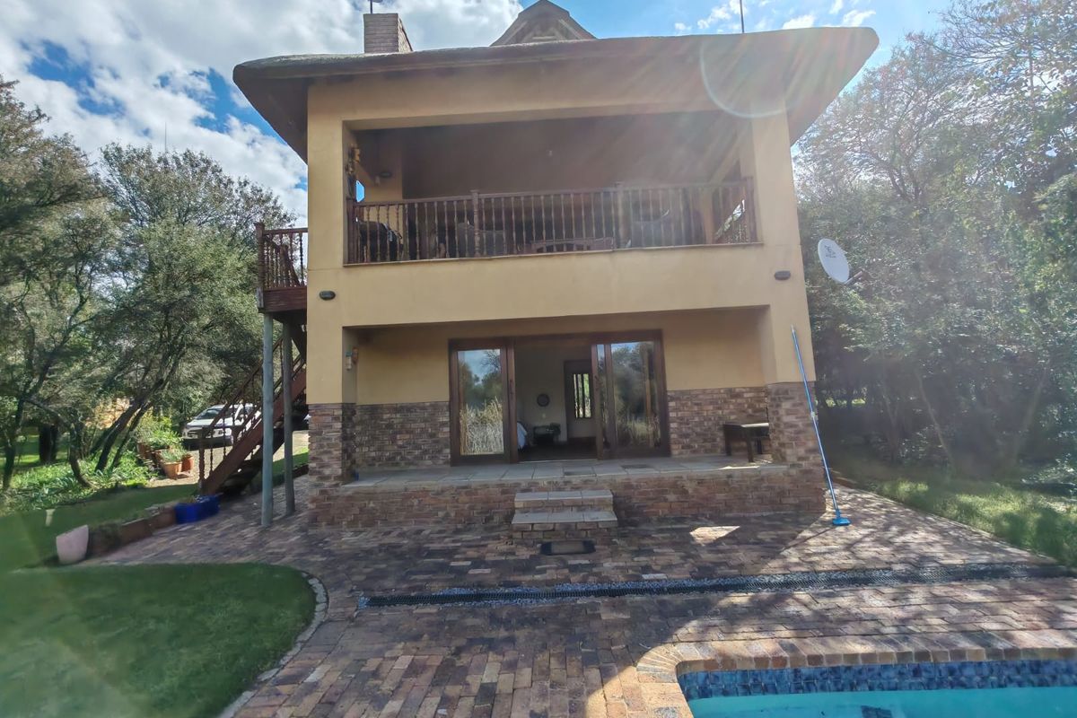 Serene bushveld retreat in a secure eco-estate with dam and Vaal River views, pool-access main suite, covered braai patio and boat locker — 4 beds, 3 baths, 2-car.