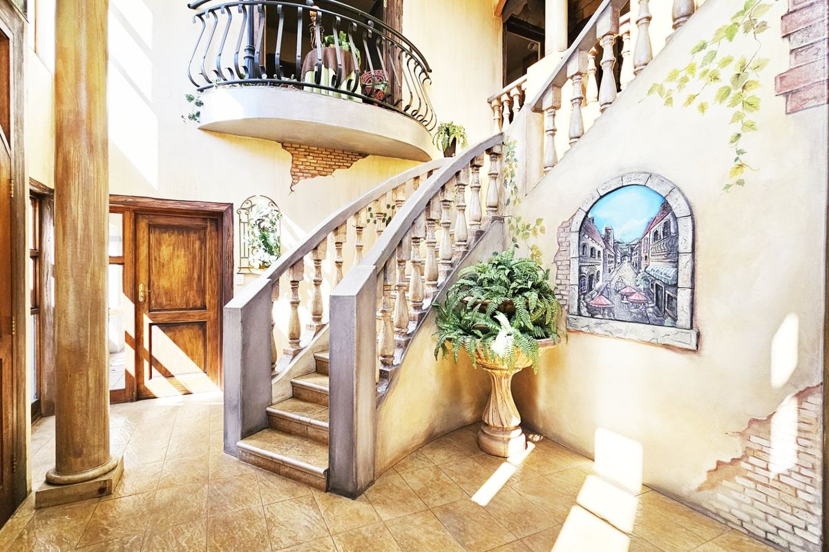 Accommodation is elegantly arranged over three levels, with the basement featuring a private cinema and a built-in bar. For the avid entertainer, this home is a dream come true. Grand double doors open to reveal a character-filled interior, adorned with charming fireplaces, artful murals, and a sweeping staircase leading to further striking features and balconies that command admiration.