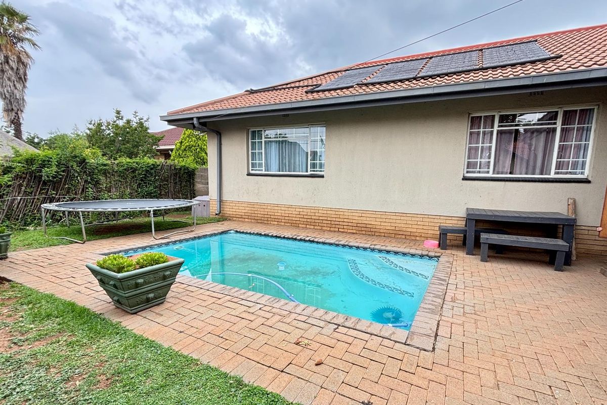Entertainer's dream in Vaalpark, Sasolburg — relaxed suburban living with private garden and fiberglass pool, flatlet for guests, study, and five bedrooms with three bathrooms.