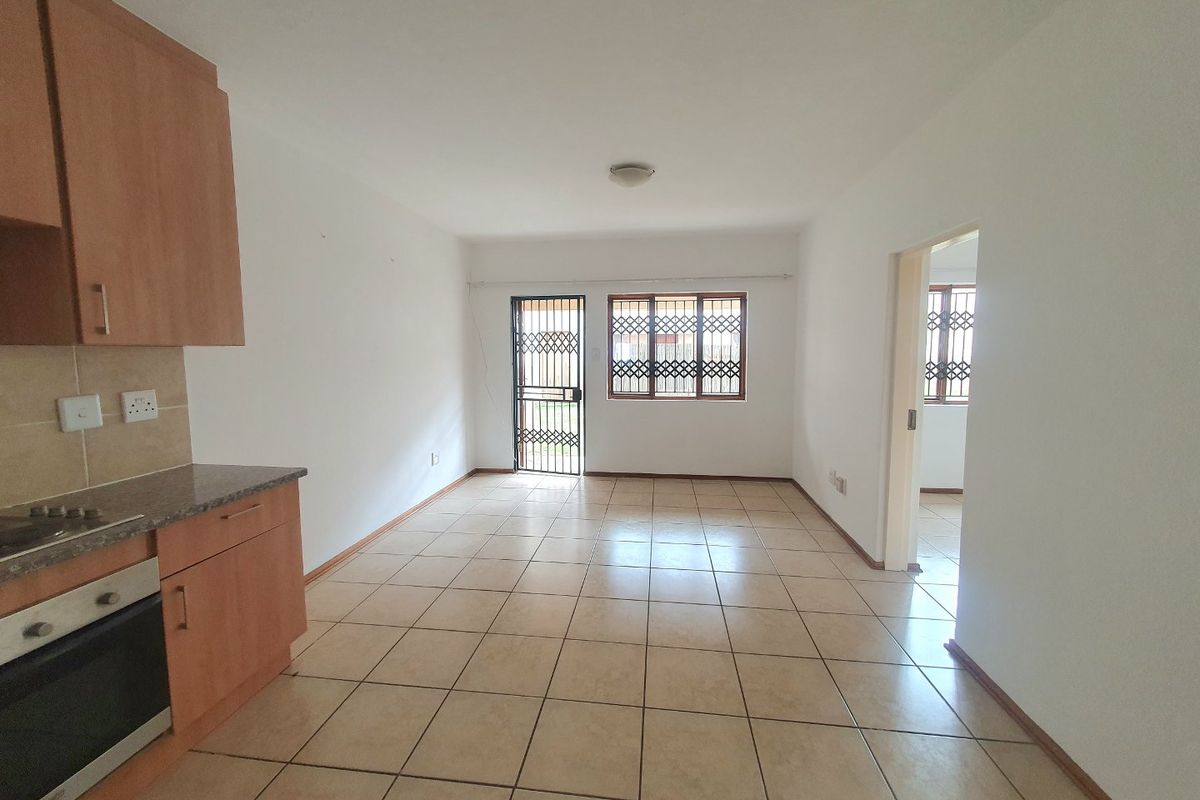 Ground floor 1-bedroom apartment in secure golf estate with open living area, kitchen, and en-suite bathroom.