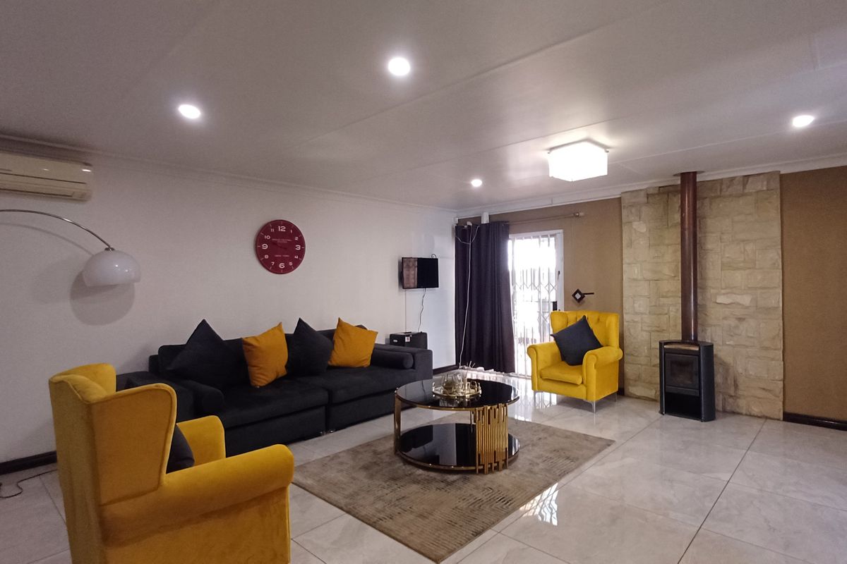 Family-focused entertaining in a quiet suburb on 1,277 m², with closed lapa, bar/braai and inground pool — four bedrooms, two bathrooms, single garage and covered parking.