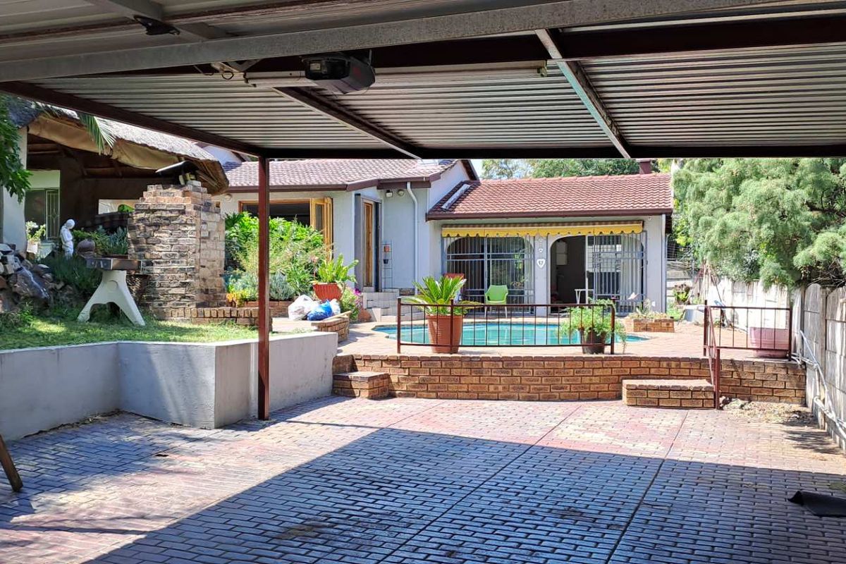 Entertainers' private garden oasis with thatched lapa and pool, plus enclosed braai area with shower. Cozy fireplace lounge, movable-island kitchen, spacious 4-car garage, three bedrooms.