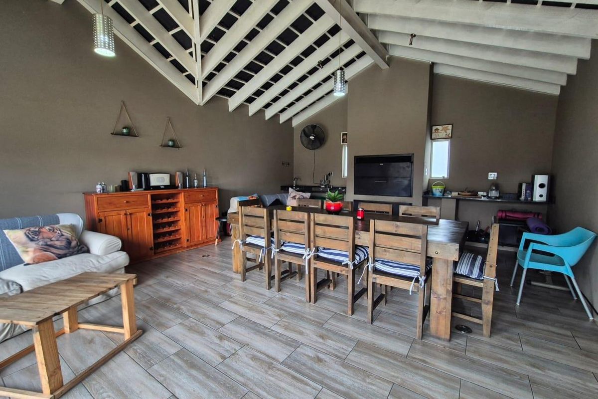 Step inside the main house to find a spacious lounge and open-plan living areas. An expansive entertainment area with high ceilings, a built-in braai, and sliding doors leads to the sparkling pool — perfect for gatherings or quiet evenings at home. There is also a separate TV room for more intimate family moments. The massive kitchen is a chef’s delight, featuring ample cupboard space, a gas stove, a breakfast nook, and generous room for multiple appliances.