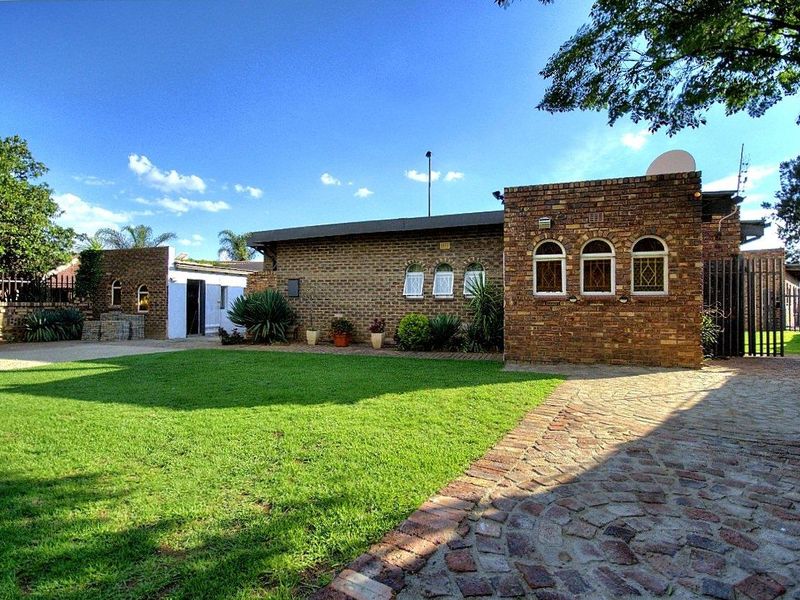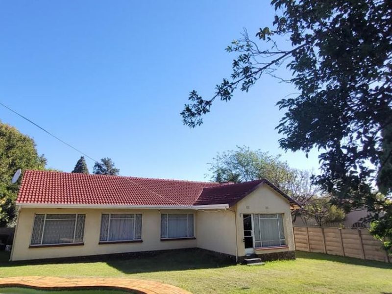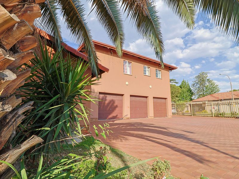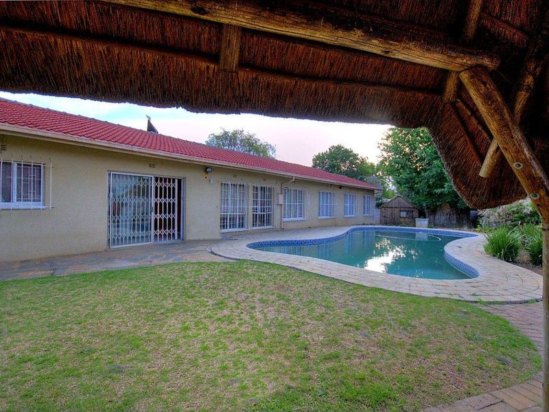 Entertainers' private garden oasis with thatched lapa and pool, plus enclosed braai area with shower. Cozy fireplace lounge, movable-island kitchen, spacious 4-car garage, three bedrooms.