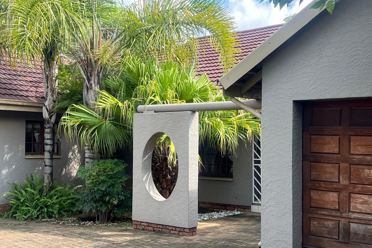 Ideal for family living and entertaining in a private, leafy setting — huge thatched entertainment area with built-in braai, pool, modern kitchen; includes 4 beds, 3.5 baths and double garage.