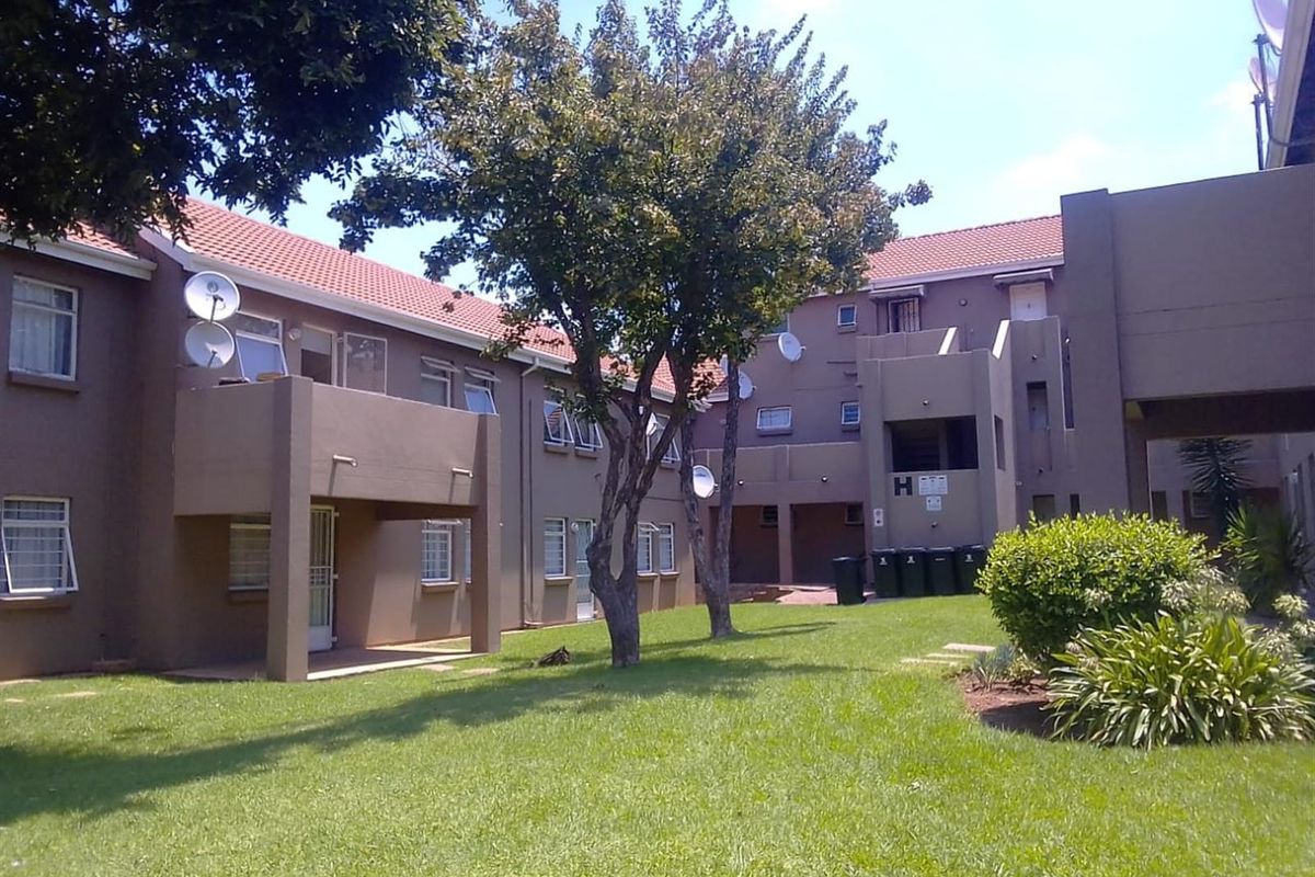 Secure, easy suburban living in Florentia, Alberton — second-floor SaxonHof townhouse with communal swimming pool, fitted kitchen and carport; two bedrooms and one bathroom.
