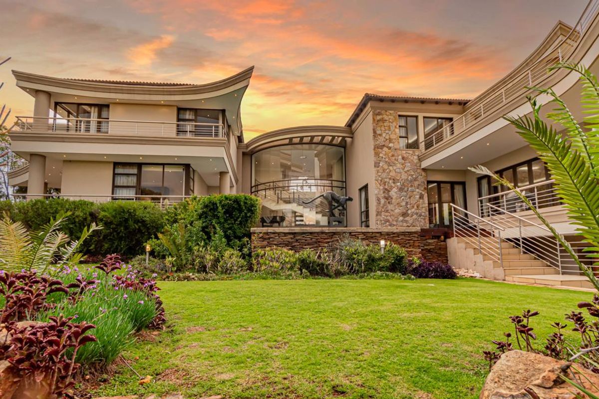 Embrace refined living in Meyersdal Eco Estate with nature trails, clubhouse and panoramic sunset views; dramatic glass-floor TV lounge, wraparound patio and pool; five bedrooms, six baths, five-car garage.