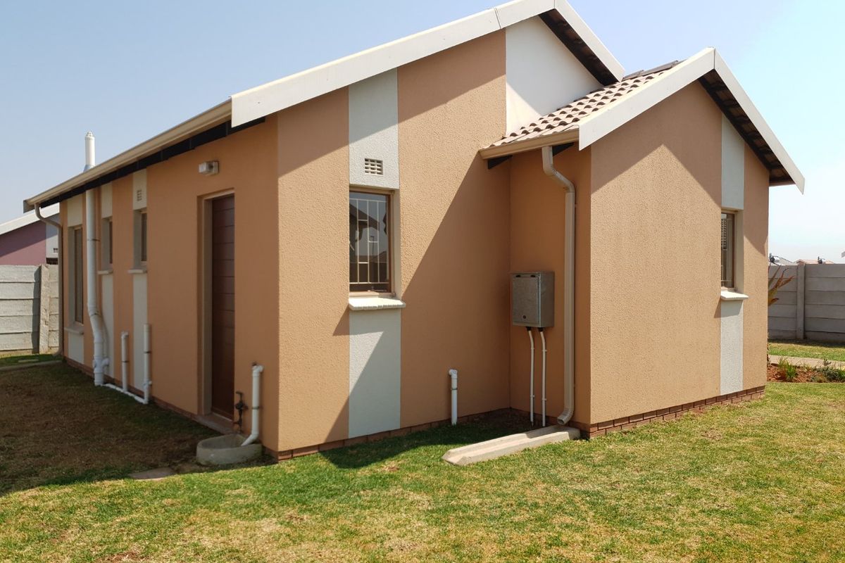 Active family living with parks, jogging trails and jungle gyms in Sky City, 20 minutes from Johannesburg CBD. Secure, enclosed development with solar geyser; two-bedroom, one-bath home.