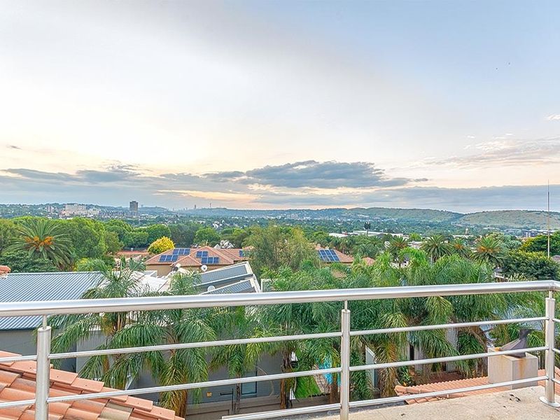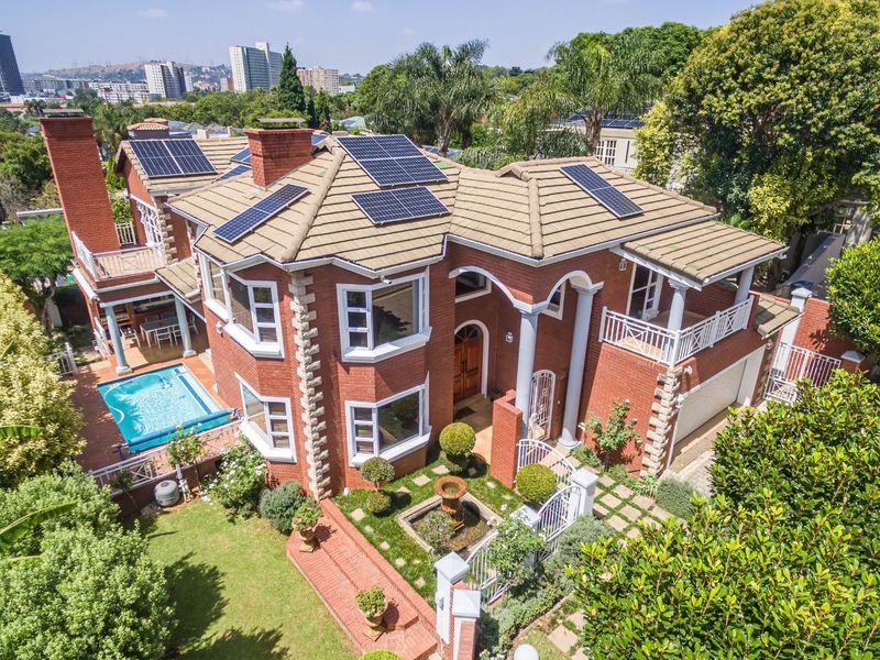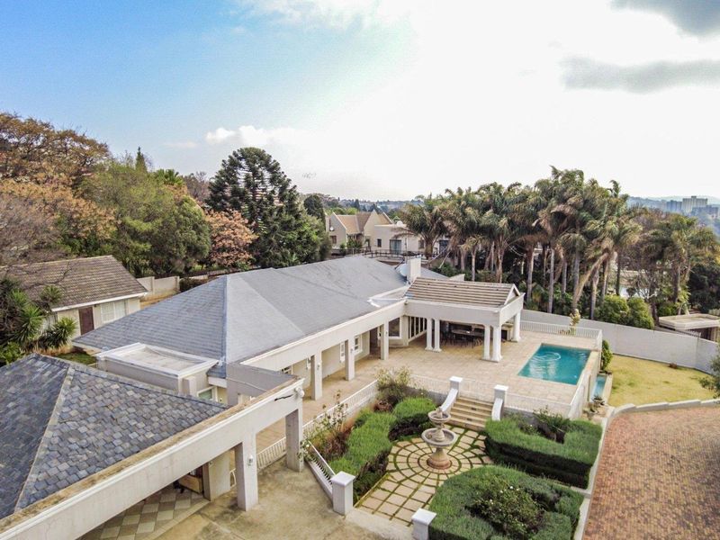 Entertain in grand style with panoramic city views from a rooftop terrace in Bedfordview; expansive manicured garden, pool, jacuzzi and sauna — eight en-suite bedrooms and eight garages.