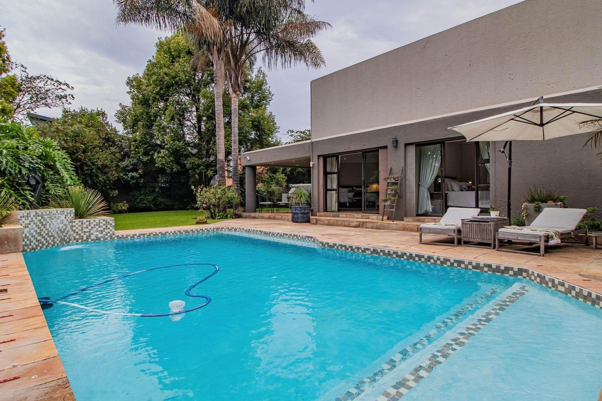 The lower level is expertly designed for family living and entertainment. It includes a cozy family room, a spacious dining area, and a modern kitchen equipped with double ovens, a gas hob, and a scullery. The TV room, featuring a gas fireplace, offers the perfect setting for relaxing evenings. Stacker doors open onto a charming patio and beautifully landscaped garden, which houses a sparkling pool—a true oasis for outdoor enjoyment. A guest loo and a study are also conveniently located downstairs.