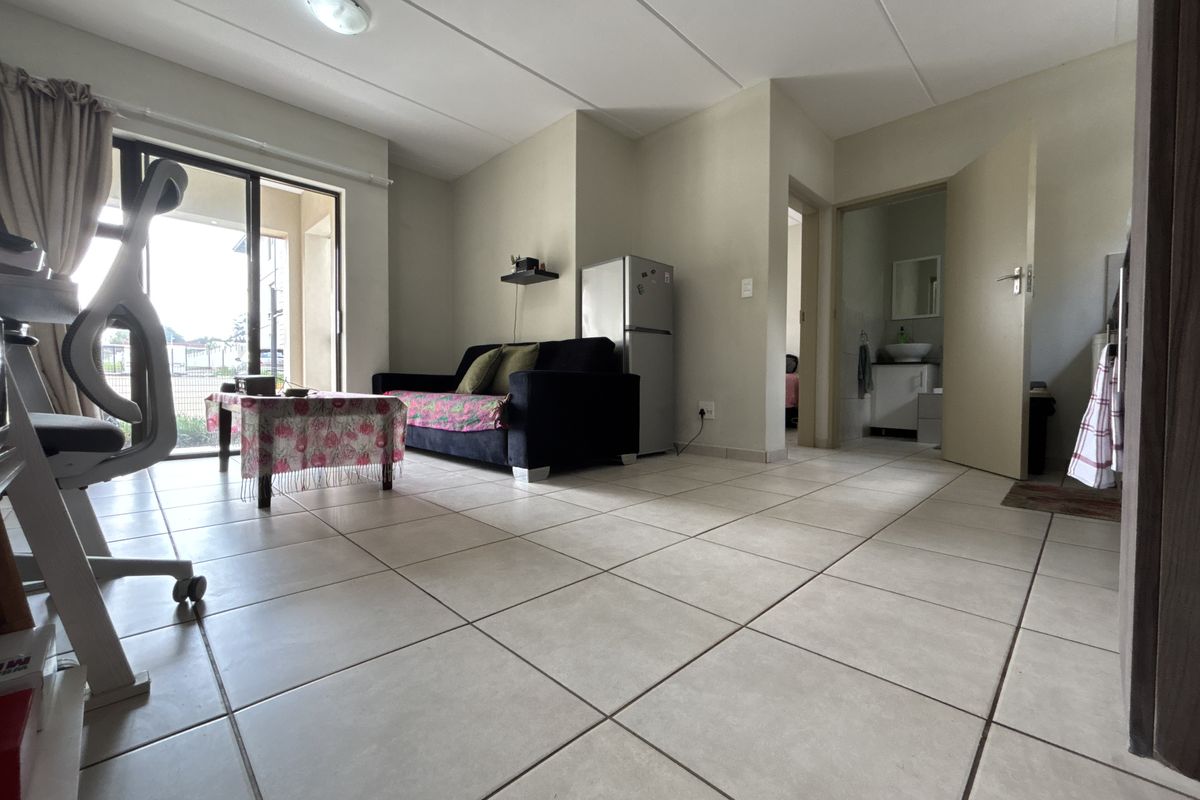 Private garden living with open-plan flow and full solar backup in Brentwood Park, Benoni — secure complex with pool, clubhouse, braai area and playground. One bedroom, one bath, two covered parking.